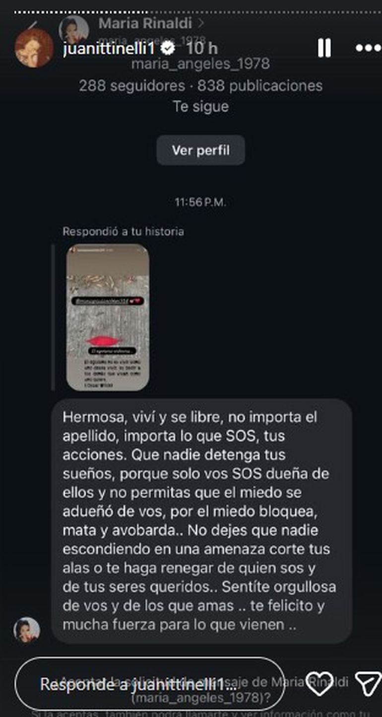 En las últimas horas la hija de Marcelo Tinelli compartió en sus historias de Instagram más de 60 posteos con mensajes fortalecedores que le enviaron sus seguidores a los mensajes directo de su cuenta personal donde tiene 2.7 millones de seguidores. “Abrazate fuerte a tu mami que ella tiene las cosas más que claras, es una mujer muy madura. Recuperá esa hermosa sonrisa que tenías de niña”, reza el mensaje de una usuaria de la red.
