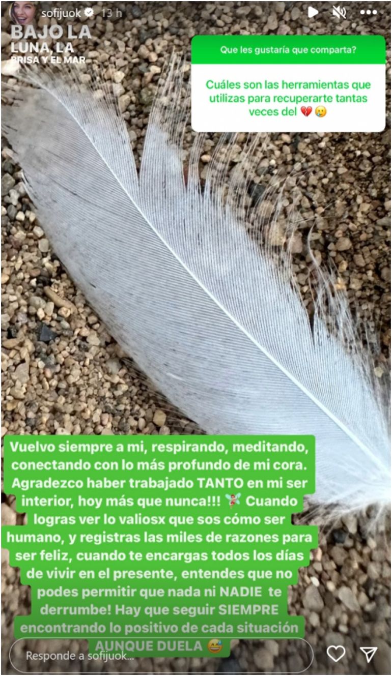 "Cuando lográs ver lo valioso que sos como ser humano y registrás las miles de razones para ser feliz, cuando te encargás todos los días de vivir el presente, entendés que no podés permitir que nada ni nadie te derrumbe. Hay que seguir siempre encontrando lo positivo de cada situación, aunque duela", agregó Sofía Jujuy.