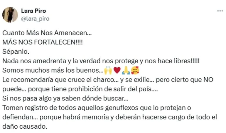 "Cuanto más nos amenacen… MÁS NOS FORTALECEN. Sépanlo", escribió Lara Piro en su cuenta de X, quien además de ser una reconocida abogada, es también la esposa del periodista Rodolfo Barilli.
