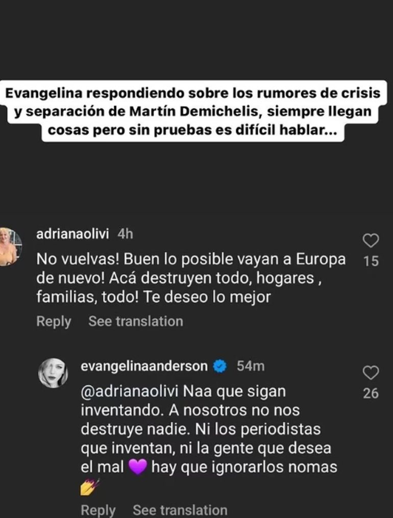 “¡No vuelvas! En lo posible váyanse a Europa de nuevo. Acá destruyen todo, hogares, familias, todo. ¡Te deseo lo mejor!”, le sugirió una usuaria. "Naa... que sigan inventando. A nosotros no nos destruye nadie. Ni los periodistas que inventan ni la gente que desea el mal. Hay que ignorarlos nomás", respondió ella.