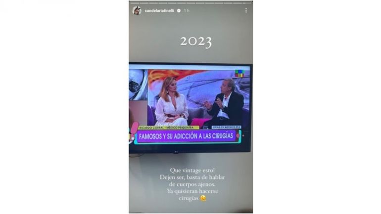Sin embargo, esto no pareció agradar a Cande Tinelli, quien no evitó mostrar su enojo ante este debate. Desde sus redes, la hija de Marcelo Tinelli explotó, le sacó una foto la pantalla, en donde se puede ver el zócalo “Famosos y su adicción a las cirugías” y escribió: “2023. ¡Qué vintage esto! Dejen ser, basta de hablar de cuerpos ajenos. Ya quisieran hacerse cirugías".
