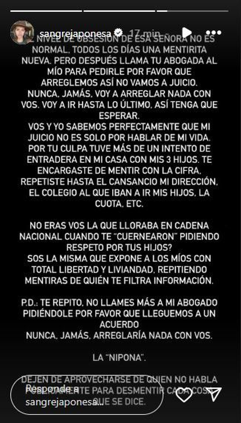 Después agregó furiosa: “¿No eras vos la que lloraba en cadena nacional cuando te “cuernearon” pidiendo respeto por tus hijos? Sos la misma que expone a los mios con total libertad y liviandad, repitiendo mentiras de quién te filtra información”.