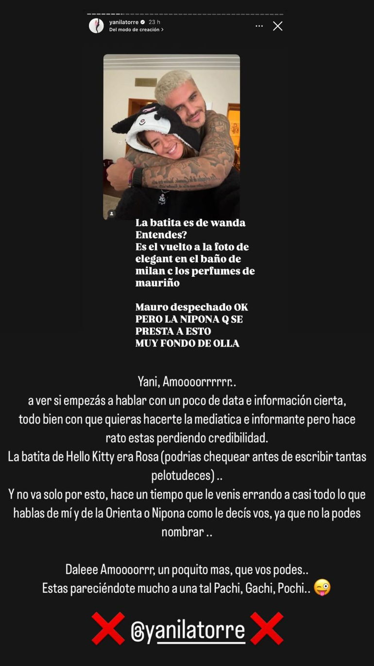 Primero fue Mauro Icardi quien desmintió la versión de la panelista de LAM, quien dijo que en su estadía en Milán, la China había usado una prenda de Wanda Nara: "Podrías chequear antes de escribir tantas p....... Hace tiempo que le venís errando a casi todo lo que hablas de mí, y de la oriental o Nipona, como le decís vos".