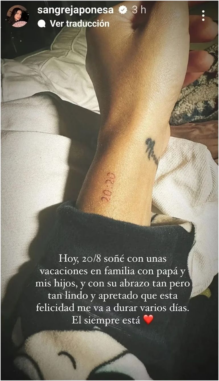 "Hoy, 20/8 soñé con unas vacaciones en familia con papá y mis hijos, y con su abrazo tan pero tan lindo y apretado que está felicidad me va a durar varios días. Él siempre está", compartió con emoción, acompañando su mensaje con un corazón rojo, ese símbolo universal que traspasa las palabras.
