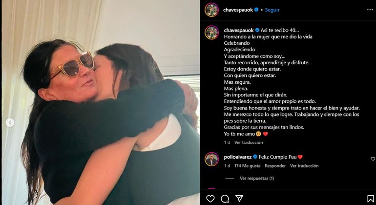"Así te recibo 40… Honrando a la mujer que me dio la vida. Celebrando. Agradeciendo. Y aceptándome como soy… Tanto recorrido, aprendizaje y disfrute. Estoy donde quiero estar. Con quien quiero estar. Más segura. Más plena. Sin importarme el que dirán", escribió Paula Chaves al compartir una foto junto a Alejandra Schulz, su madre.
