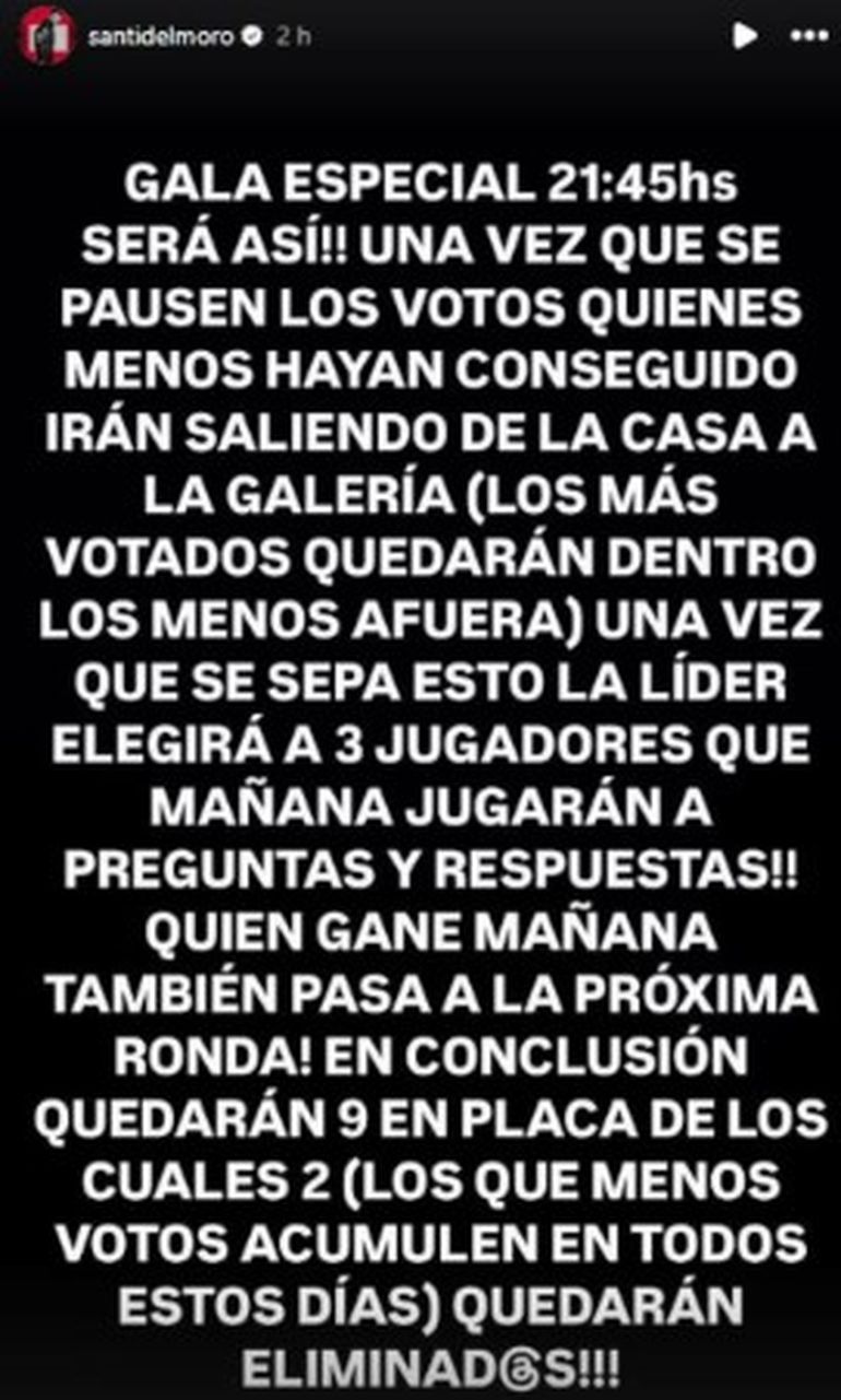 En sus redes sociales Santiago contó detalles de un nuevo sistema implementado. Tal como suele hacer en su cuenta personal donde suma 4,5 millones de seguidores. “Gala especial. Será así: una vez que se pausen los votos, quienes menos hayan conseguido, irán saliendo de la casa a la galería (los más votados quedarán adentro; los menos, afuera)”, relató el conductor a través de las historias de Instagram.