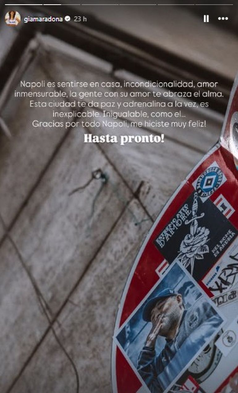 “Napoli es sentirse en casa, incondicionalidad, amor inmensurable, la gente con su amor te abraza el alma. Esta ciudad te da paz y adrenalina a la vez, es inexplicable. Inigualable, como él… ¡Gracias por todo Napoli, me hiciste muy feliz! ¡Hasta pronto!”, escribió Giannina en una historia de la red social Instagram.
