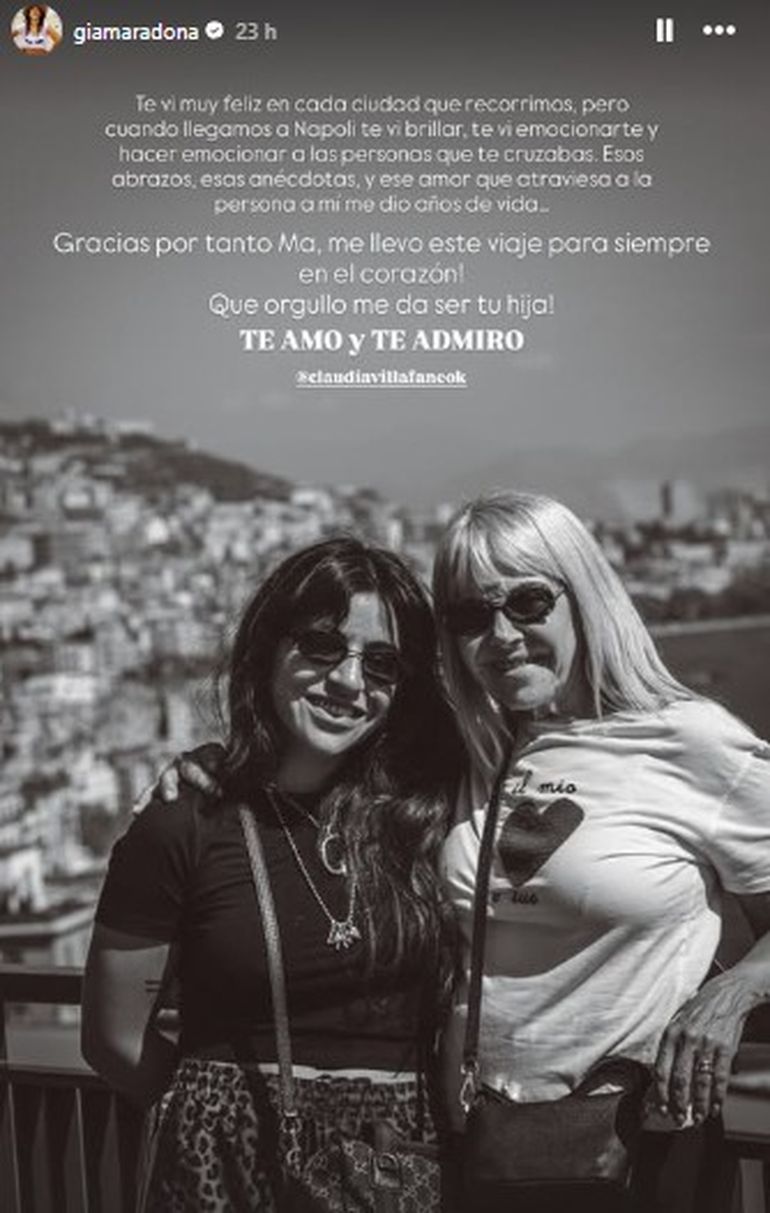 En otra publicacción seguida a la mencionada, Giani le dedicó una emotivas palabras a su madre Claudia Villafañe, que compartió el viaje junto a ella: “Te vi muy feliz en cada ciudad que recorrimos, pero cuando llegamos a Napoli te vi brillar, te vi emocionarte y hacer emocionar a las personas que te cruzabas. Esos abrazos, esas anécdotas, y ese amor que atraviesa a la persona a mamá me dio años de vida. Gracias por tanto Ma, me llevo este viaje para siempre en el corazón. Qué orgullo me da ser tu hija. TE AMO Y TE ADMIRO”, escribió sobre una imagen que la muestra juntas.
