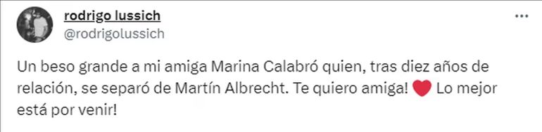 “Un beso grande a mi amiga, Marina Calabró quien, tras diez años de relación, se separó de Martín Albrecht. ¡Te quiero amiga! ¡Lo mejor está por venir!”, escribió el periodista en un tuit para tratar de tirarle buena onda a su amiga en este momento complicado.