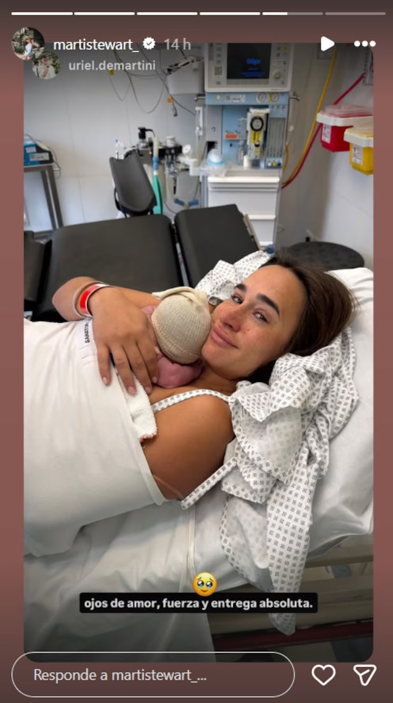 En las primeras imágenes que subió Martina, pudieron verse desde el camino hacia el quirófano, las primeras horas posteriores al nacimiento y el instante en que su pareja Uriel sostiene entre brazos a la beba. Martina sintetizó el sentimiento de esta nueva etapa con una frase breve y contundente: “Amores de mi vida”.