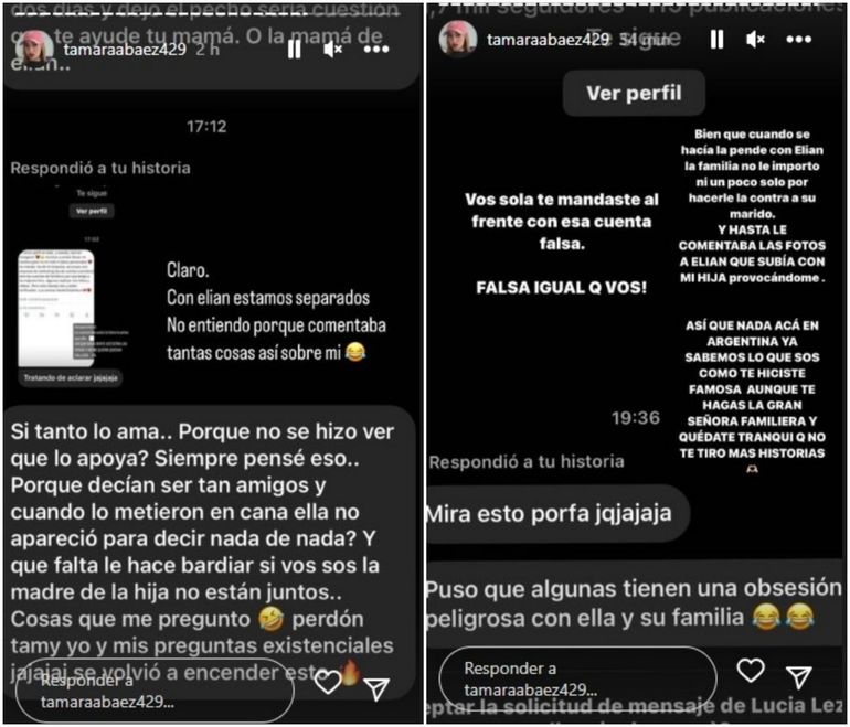 “Cuando Elián subió foto afuera de casa, miren lo que le puso jajajajaja y yo le digo EL cacas con mucho amor. La caca sos vos, mujer grande haciendo estas cosas", remarcó Tamara, enfocando su crítica en el presunto uso de perfiles falsos para comentarios negativos.