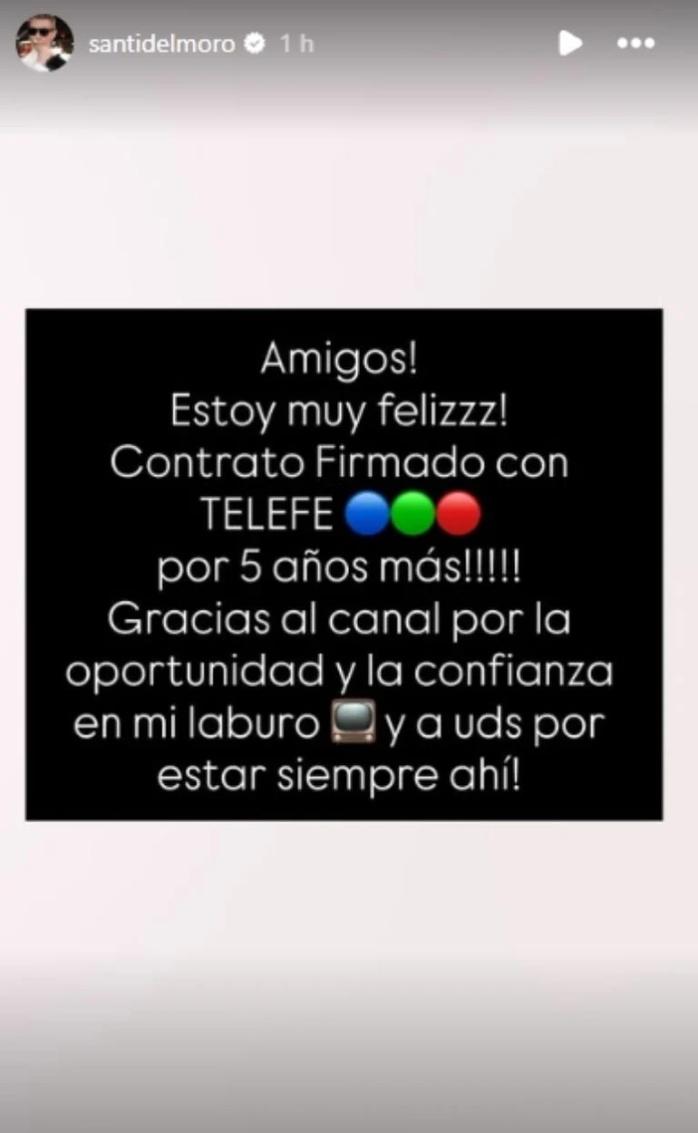 “Amigos, estoy muy feliz, contrato firmado con Telefe por 5 años más, gracias al canal por la oportunidad y la confianza en mi laburo y a ustedes por estar siempre ahí”, publicó el conductor en sus historias de Instagram, compartiendo su alegría con todos sus seguidores. El conductor renovó su vínculo con la pantalla con más rating de la televisión abierta Argentina.