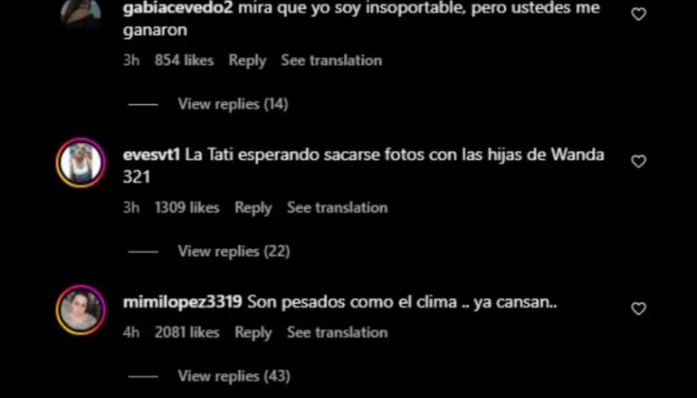 "Mira que yo soy insoportable, pero ustedes me ganaron", "Son pesados como el clima", "La Tatiesperando sacarse fotos con las hijas de Wanda, 3,2,1...", "El bigote de carne de la nipona", escribieron algunos de los usuarios sobre el posteo que contó con tres imágenes de ambos juntos.
