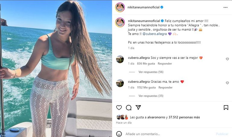 "Feliz cumpleaños mi amor! Siempre haciéndole honor a tu nombre ‘Allegra. Tan noble, justa y sensible, estoy orgullosa de ser tu mamá! Te amo!", escribió Niki en su cuenta personal de Instagram. En respuesta al mensaje de su madre, Allegra contestó: "Gracias Ma, te amo. Sos y siempre vas a ser la mejor", acompañado con emojis de corazones.