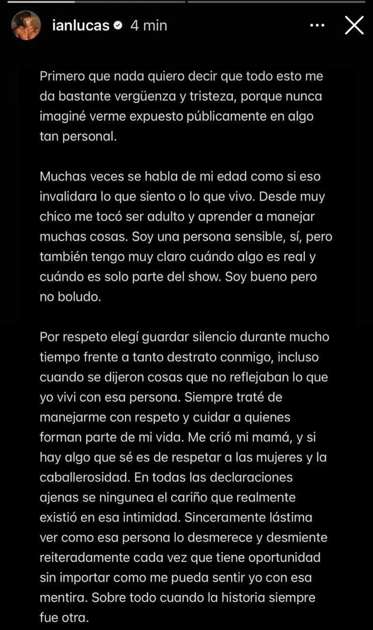 "Muchas veces se habla de mi edad como si eso invalidara lo que siento o lo que vivo. Desde muy chico me tocó ser adulto y aprender a manejar muchas cosas. Soy una persona sensible, sí, pero también tengo muy claro cuándo algo es real y cuándo es solo parte del show. Soy bueno, pero no boludo", sentenció Ian Lucas a través de sus historias de Instagram, exponiendo su malestar por cómo la ex de Martín Demichelis hizo un juego mediático de su incipiente relación.