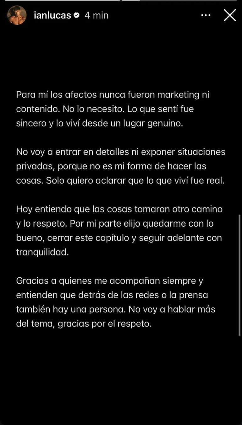 Ian aseguró que no brindará detalles de la relación, pero aclaró que "lo que viví fue real". "Hoy entiendo que las cosas tomaron otro camino y lo respeto. Por mi parte elijo quedarme con lo bueno, cerrar este capítulo y seguir adelante con tranquilidad", agregó en su comunicado. Y el youtuber y cantante cerró: "Gracias a quienes me acompañan siempre y entiende que detrás de las redes o la prensa también hay una persona. No voy a hablar más del tema, gracias por el respeto".