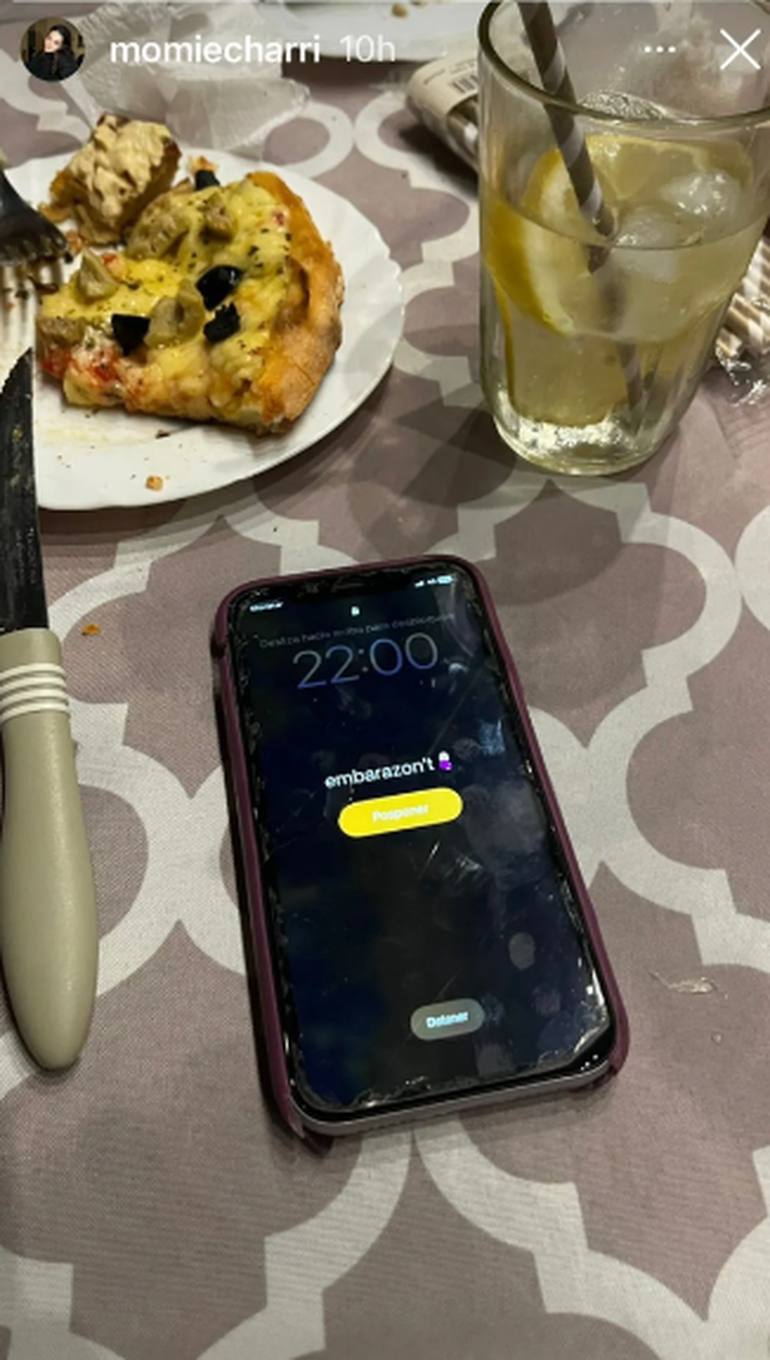 En una historia de Instagram, que tienen 24 horas de vigencia, More compartió una foto donde se puede ver una porción de pizza, junto a un vaso con bebida y una frase que apareció en su celular, junto a una alarma, que decía: “embarazon’t!”, junto a un emoji de una mujer embarazada.