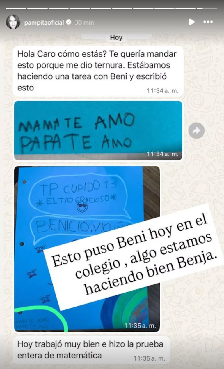 Acompañando la publicación, y en claro apoyo de su ex, la modelo agregó: “Esto puso Beni hoy en el colegio. Algo estamos haciendo bien, Benja”. De esta manera, Pampita expuso que la relación de Bautista, Beltrán y Benicio con su papá es muy buena.