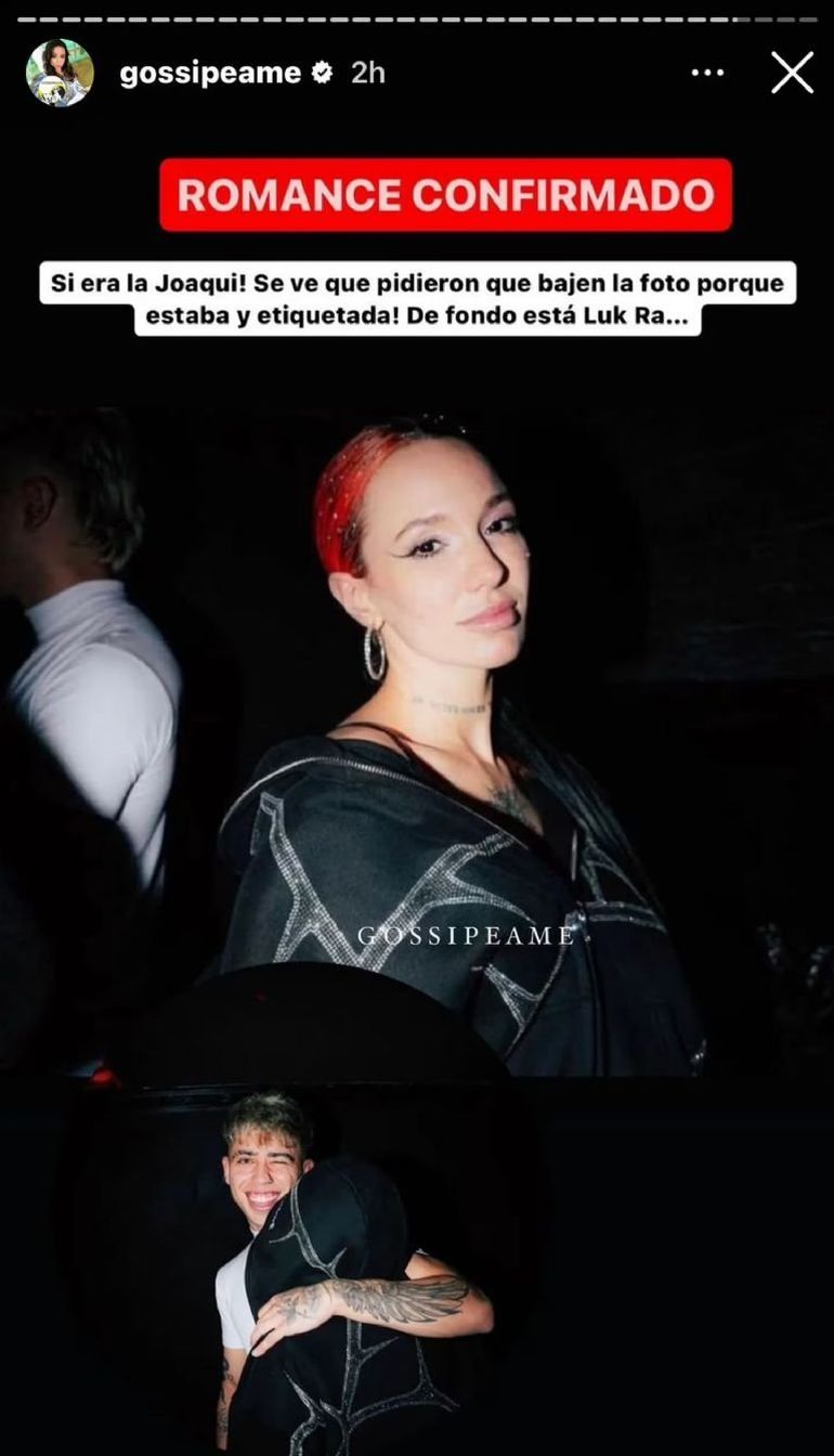 “Romance confirmado”, expuso la panelista, sin vueltas en su cuenta de Instagram sobre la relación entre cantantes que está dando qué hablar. "Sí, era La Joaqui. Se ve que pidieron que bajen la foto porque estaba y etiquetada. De fondo está Luck Ra”, agregó la periodista, con la imagen que demostraba que La Joaqui usaba un buzo con brillos idéntico.