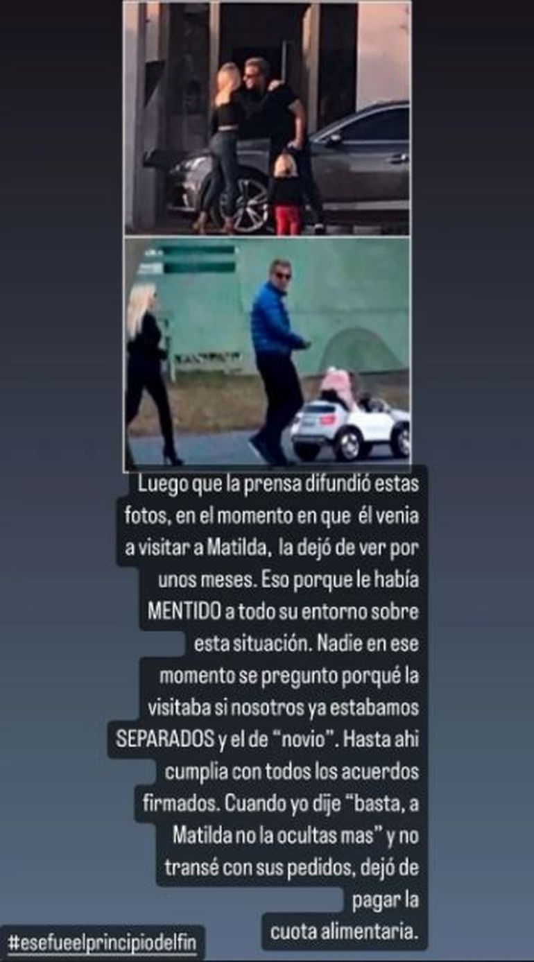 "Luego de que la prensa difundió estas fotos de cuando él venía a visitar a Matilda, la dejó de ver por unos meses. Él le había MENTIDO a todo su entorno sobre esta situación. Nadie en ese momento, se preguntó por qué la visitaba si nosotros ya estábamos SEPARADOS y él, de 'novio'. Hasta ahí, cumplía con todos los acuerdos firmados". reza el texto publicado por la ex vedette.