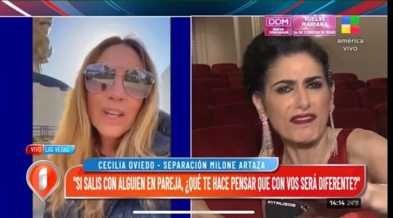 Desde Las Vegas, Cecilia Oviedo, la ex mujer de Nito Artaza, brindó un móvil en vivo para Intrusos (América) y criticó duramente a Cecilia Milone. En detalle, la ex vedette apuntó contra el padre de su hijo y la reconocida actriz por haber vivido un relación de pareja a escondidas cuando ella aún estaba casada con el humorista.