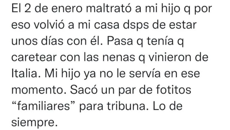 Sin embargo, en las últimas horas, la ex mujer del futbolista le hizo una fuerte denuncia, que relaciona al hijo que tienen en común: “El 2 de enero maltrató a mi hijo que por eso volvió a mi casa después de estar unos días con él. Pasa q tenía que caretear con las nenas que vinieron de Italia. Mi hijo ya no le servía en ese momento. Sacó un par de fotitos ‘familiares’ para la tribuna. Lo de siempre”.