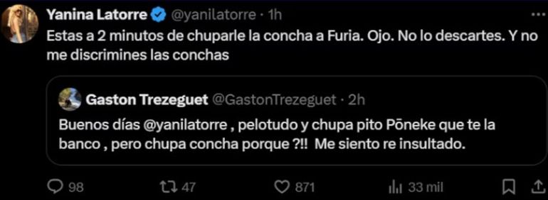Las redes sociales fueron el canal donde Trezeguet tuvo un nuevo y tenso cruce con la periodista de chimentos e integrante del programa LAM Yanina Latorre, donde no se guardaron nada en la discusión y sacaron los trapitos al sol. “Buenos días, Yanina (Latorre)... Pelotudo y chupa pito, ponele que te la banco, pero chupa concha... ¿Por qué? Me siento re insultado”, escribió Gastón en su cuenta de X (ex Twitter).