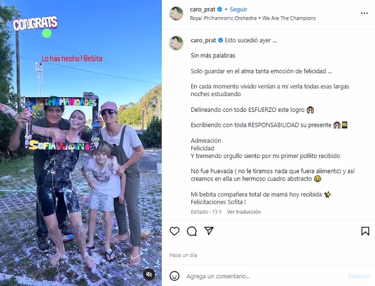 Con profunda emoción, la conductora publicó en su cuenta de Instagram un video con postales del festejo y le dedicó unas emotivas palabras a su primogénita. El metraje fue musicalizado con una versión instrumental de “We Are the Champions” de Queen, donde recopiló clips y fotos de la recibida de su hija. La egresada posó con un marco donde se pudo leer: “Licenciada en Humanidades. Sofía Andino”, junto con algunos dibujos que representan a su carrera. Como suele ocurrir en este tipo de eventos, le arrojaron nieve, serpentinas y pinturas de colores y la cara de felicidad lo dijo todo.