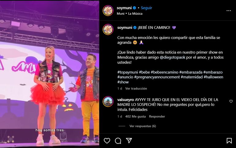 “Hoy no somos dos (en el escenario), hoy somos tres porque estoy embarazada”, lanzó ante su público atento que estalló de alegría cuando lo comunicó. Es por eso que Diego Topa, su compañero de shows, sumó unas lindas palabras para este tierno momento: “Se agranda la familia de Muni. ¡Ay amiga, qué hermoso poder compartirlo! Yo ya lo sabía pero no podía decir nada”