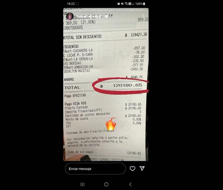 Acto seguido, mostró el ticket de la compra que superó los 120 mil pesos, monto que se achicó por haber aprovechado diferentes descuentos que ofrecieron en el lugar.