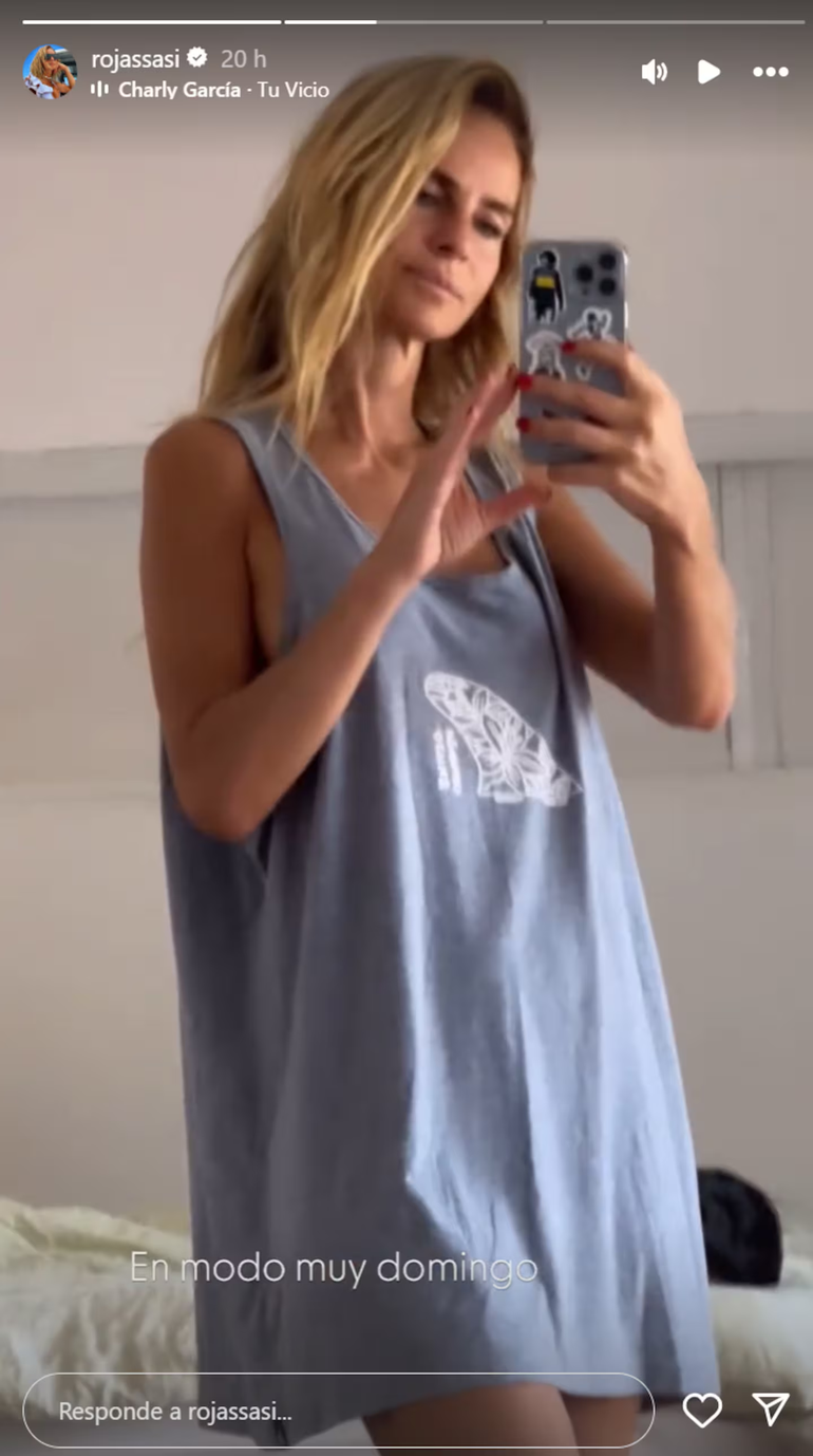 Todo comenzó cerca de las 10 de la mañana. Recién levantada, la modelo saludó a sus seguidores mientras tomaba mate. “Buen día”, escribió. Acto seguido, se tomó una selfie frente a un espejo con el cabello suelto. Pero lo que llamó la atención fue la remera que llevaba puesta: una musculosa holgada de color gris claro con un diseño blanco impreso en la parte delantera. “En modo muy domingo”, escribió. Luego sumó una foto más, recostada en la cama junto a su mascota.