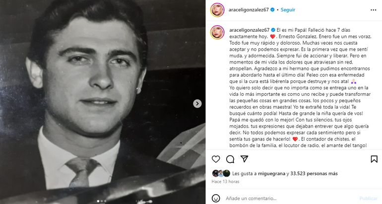 La actriz y modelo Araceli González sufrió la muerte de su padre a inicios de febrero, lo que le provocó una tristeza profunda que reflejó en su cuenta de Instagram mediante un posteo que porta imágenes de su padre y un extenso texto que estremeció a sus seguidores: “¡Él es mi Papá! Falleció hace 7 días exactamente hoy. Ernesto González, enero fue un mes voraz”, comenzó.