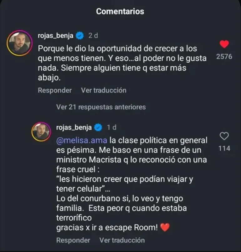 Lejos de confrontar de manera agresiva, el actor eligió sostener un tono conciliador y fomentar un diálogo respetuoso. En su respuesta, Rojas reconoció las falencias del sistema político: “La clase política en general es pésima. Me baso en una frase de un ministro macrista que lo reconoció con una frase cruel: ‘Les hicieron creer que podían viajar y tener un celular’”, dijo, citando una frase que generó gran controversia en su momento.