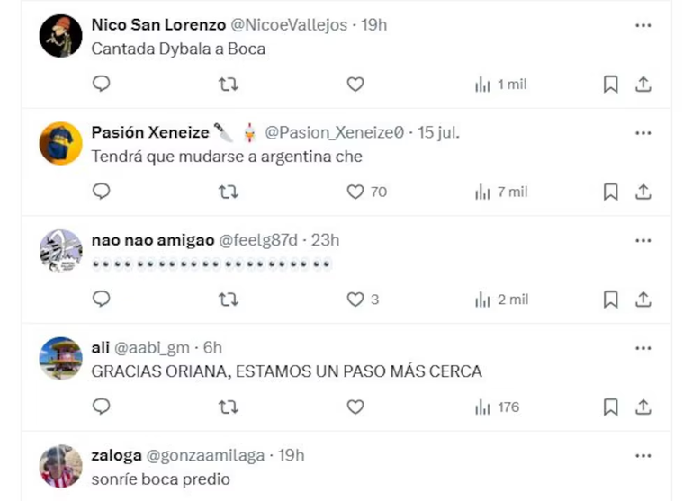En este contexto, la confirmación del programa Intrusos de que Oriana Sabatini volverá al país alentó todavía más a los seguidores Xeneizes, quienes multiplicaron mensajes en redes sociales con frases como “Dybala a Boca”, “Tendrá que mudarse a Argentina”, “Estamos un paso más cerca”, “Arranca acá. Dybala a Boca” y “Sonríe Boca Predio”.