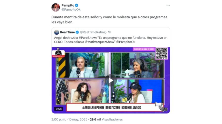 Ante esto, Pampito le respondió tajante: "Cuánta mentira de este señor y como le molesta que a otros programas les vaya bien". A su vez, publicó el rating del día y sentenció: "Picos de 4,7 hoy en Puro Show. A mi me gusta decir la verdad, fue un día difícil y la pudimos dar vuelta. Gracias por el aguante".