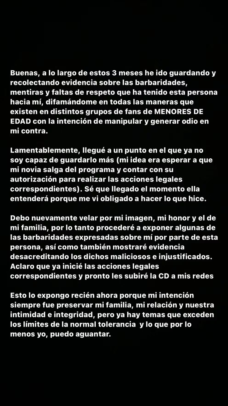 “Buenas, a lo largo de estos tres meses he ido guardando y recolectando evidencia sobre las barbaridades, mentiras y faltas de respeto que ha tenido esta persona hacia mí, difamándome en todas las maneras que existen en distintos grupos de fans de menores de edad, con la intención de manipular y generar odio en mi contra”, comenzó el texto de descargo de Manuel.