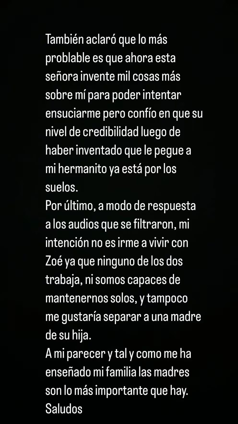 “También aclaro que lo más probable es que ahora esta señora invente mil cosas más sobre mí para poder intentar ensuciarme, pero confío en que su nivel de credibilidad luego de haber inventado que le pegué a mi hermanito ya está por los suelos. Por último, a modo de respuesta a los audios que se filtraron, mi intención no es irme a vivir con Zoe, ya que ninguno de los dos trabaja, ni somos capaces de mantenernos solos, y tampoco me gustaría separar a una madre de su hija. A mi parecer y tal y como me ha enseñado mi familia, las madres son lo más importante que hay. Saludos”, cerró el joven.