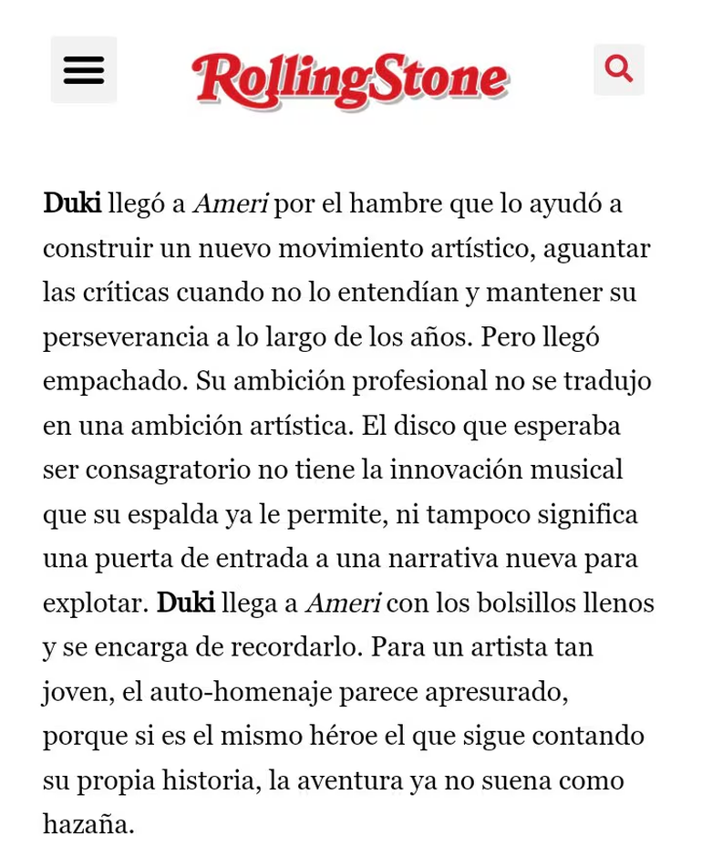 La Rolling Stone criticó duramente y no perdonó al último trabajo musical de Duki. Ameri no pasó la prueba de la prensa especializada y con un duro texto dejaron bien en claro que le pareció el último álbum del joven trapero.