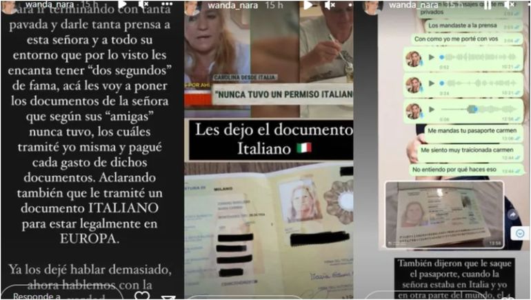 “Para terminar con tanta pavada y darle tanta prensa a esta señora y todo su entorno que por lo visto les encanta tener ‘dos segundos’ de fama, acá les voy a poner los documentos de la señora que según “sus amigas” nunca tuvo, los cuáles tramité yo misma y pagué cada gasto de dichos documentos. Aclarando también que le tramité un documento italiano para estar legalmente en Europa. Ya los dejé hablar demasiado, ahora hablemos con la verdad”, escribió Wanda antes de compartir las fotos de la carta y las fotos que prueba que ella no tenía la documentación de su empleada.