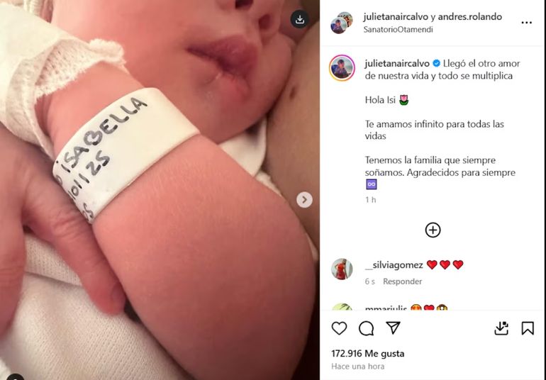 En las imágenes se pudo ver a la pequeña descansando en los brazos de su madre mientras se le puede ver la pulsera con su nombre. Asimismo, Julieta Nair Calvo también expuso fotos junto a Andrés Rolando, ya que destacó que él la acompañó en todo momento.