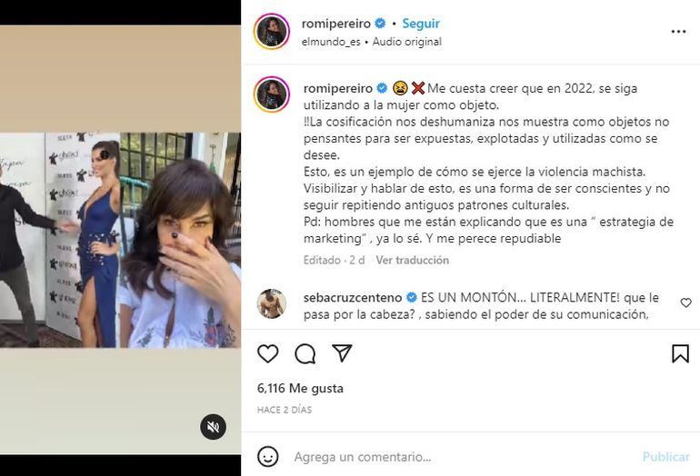 En su descargo mediante su cuenta de Instagram, expresó de manera clara y contundente qué fue lo que le molestó: "La cosificación nos deshumaniza, nos muestra como objetos no pensantes para ser expuestas, explotadas y utilizadas como se desee".