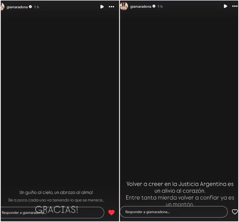 El impacto del veredicto se sintió de inmediato tanto en los medios como en las redes sociales, donde los mensajes y reacciones no tardaron en multiplicarse. Gianinna Maradona, la hija menor de Diego y Claudia Villafañe, fue una de las primeras en expresarse. A los pocos minutos de conocerse la resolución, compartió sus sentimientos en sus historias de Instagram. “Será justicia”, escribió Gianinna al ritmo de “Puente” de Gustavo Cerati, y sumó: “Un guiño al cielo, ¡un abrazo al alma! De a poco cada uno va teniendo lo que se merece… ¡Gracias!”. En un cierre cargado de emoción, completó: “Volver a creer en la Justicia argentina es un alivio al corazón. Entre tanta mierda, volver a confiar es un montón”.