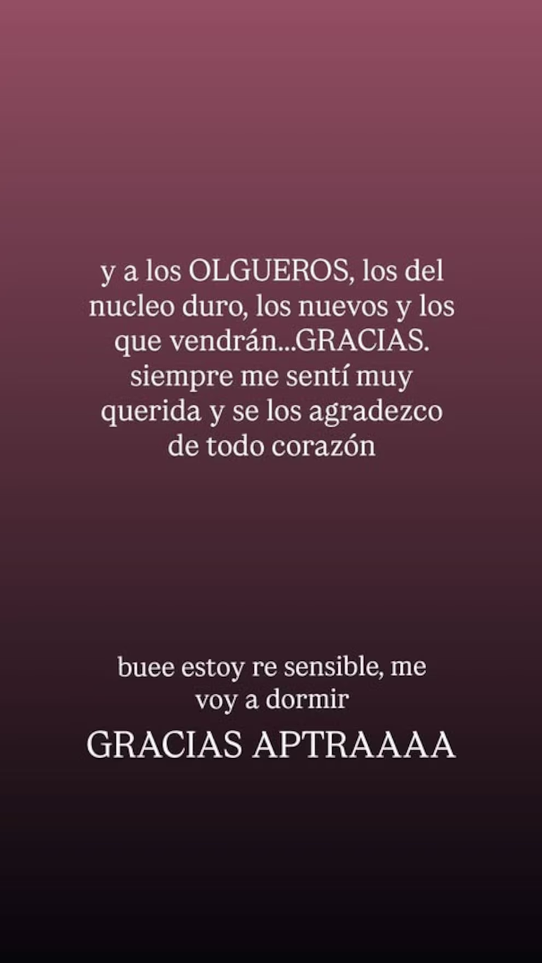 Sin embargo, la actriz decidió enfocar su energía en el trabajo y celebrar una noticia personal: está nominada como mejor coconductora de OLGA en los premios Martin Fierro al streaming. No hubo declaraciones públicas sobre su expareja; en cambio, hubo gratitud y emoción compartidas con sus seguidores.