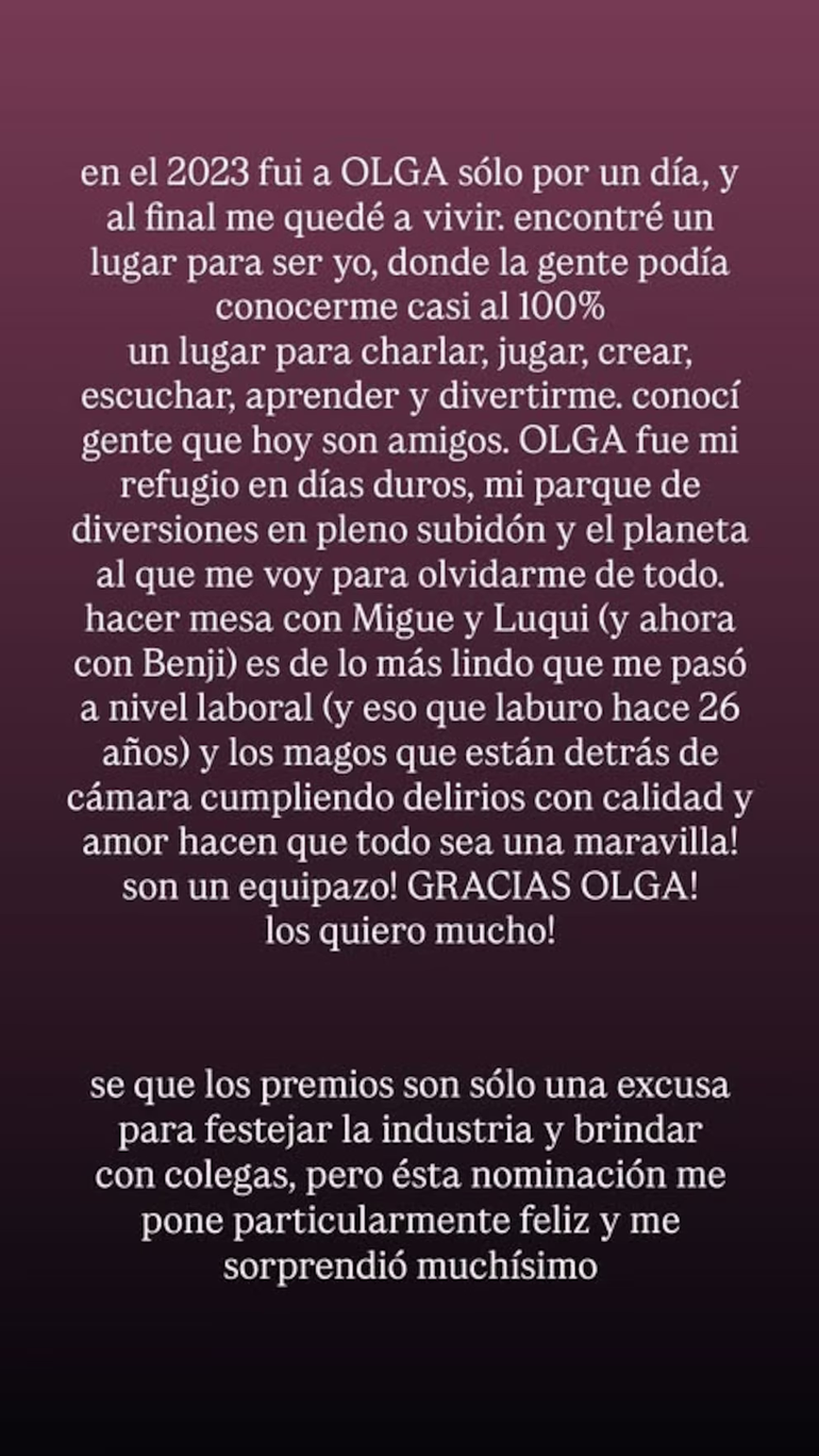 “En el 2023 fui a Olga sólo por un día y al final me quedé a vivir. Encontré un lugar para ser yo, donde la gente podía conocerme casi al 100%, un lugar para charlar, jugar, crear, escuchar, aprender y divertirme. Conocí gente que hoy son amigos. Fue mi refugio en días duros, mi parque de diversiones en pleno subidón y el planeta al que me voy para olvidarme de todo", escribió la propia nominada en sus redes.