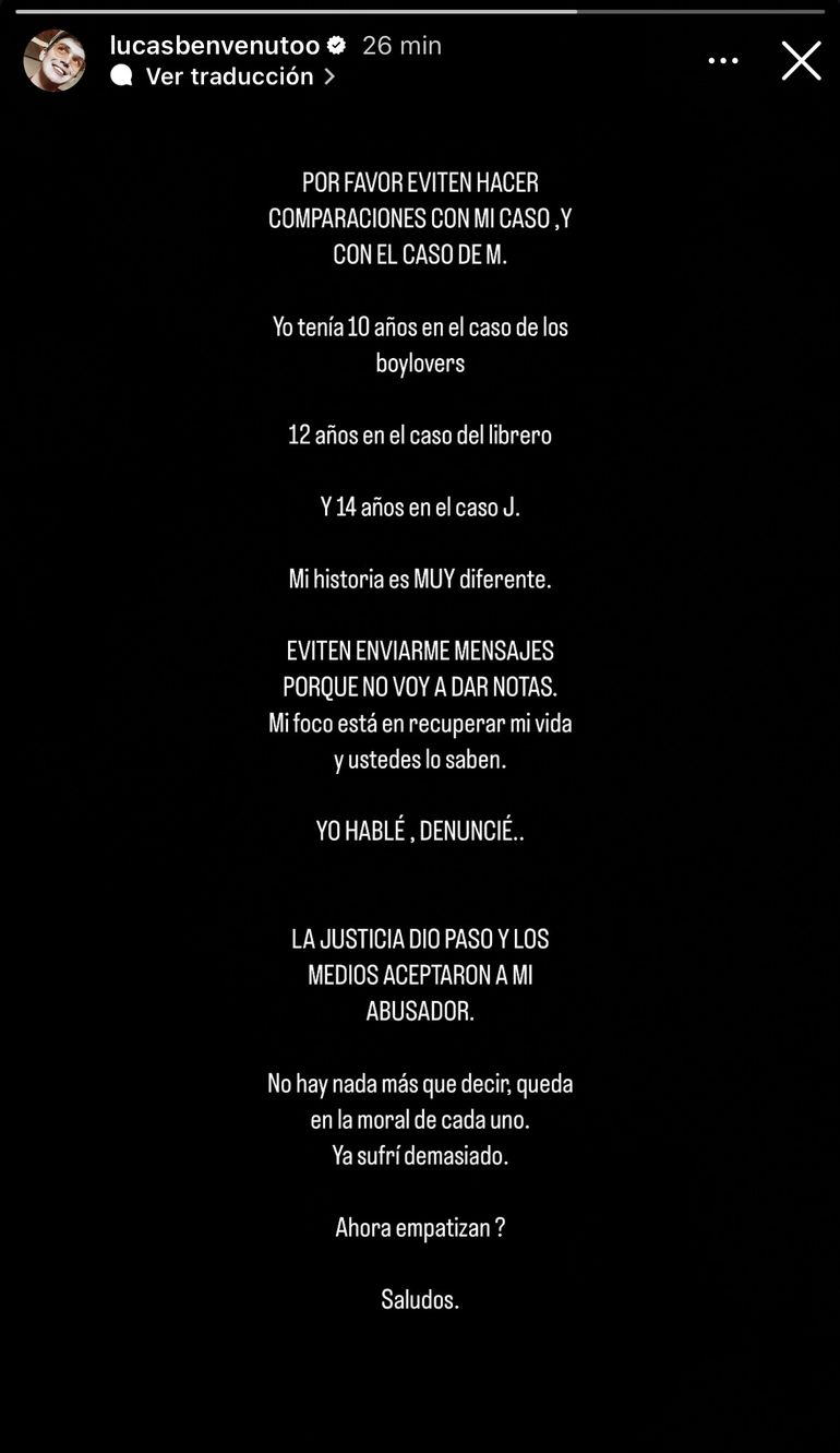 “POR FAVOR EVITEN COMPARACIONES CON MI CASO, Y CON EL CASO DE M (sin mencionar a Marley”, comenzó el comunicado que hizo Lucas en una historia con fondo negro en Instagram.