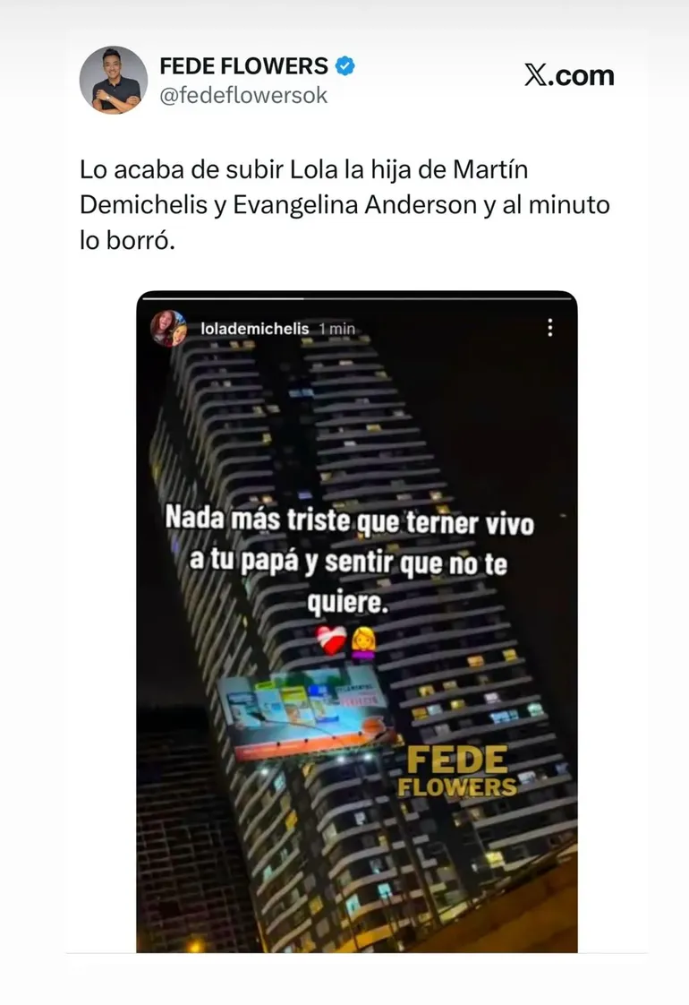 El periodista Fede Flowers compartió la historia del fuerte mensaje de Lola que decía: "Nada más triste que tener vivo a tu papá y sentir que no te quiere", acompañado por dos emojis, un corazón vendado y la cara seria de una mujer. La frase que eligió Lola deja en claro que no está pasando por un buen momento en la relación padre-hija y en las redes comenzaron a realizar todo tipo de especulaciones con respecto a la historia detrás de ese desgarrador mensaje.