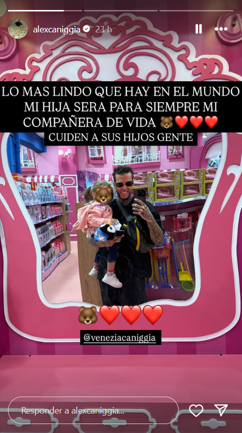 En el primer fin de semana después de anunciar su separación de Melody Luz, Alex Caniggia compartió un día con su hija Venezia. A través de su cuenta de Instagram, siempre fiel a su estilo ostentoso, mostró el paseo de compras que hicieron por una juguetería y los momentos de padre e hija que disfrutaron.