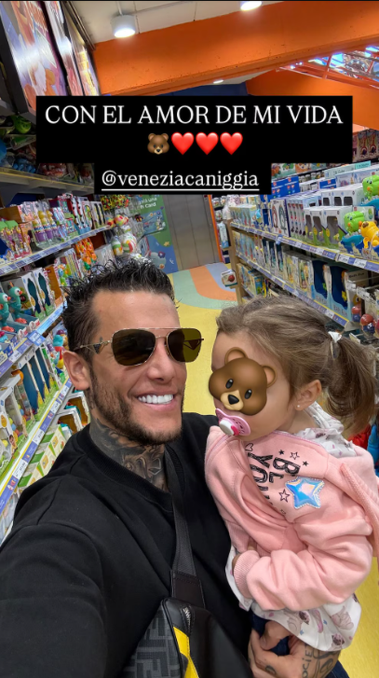 Luego el ganador de El Hotel de los Famosos mostró a su hija en una juguetería. “Con el amor de mi vida”, escribió, junto a una selfie sonriendo, mientras a su nena le cubrió la cara, para preservar su identidad, con el emoji de un oso. “Todo para la osa. Soy el mejor padre del mundo. Corta la boca”, lanzó, mientras filmaba un pasillo todo pintado de rosa con todo tipo de muñecas.