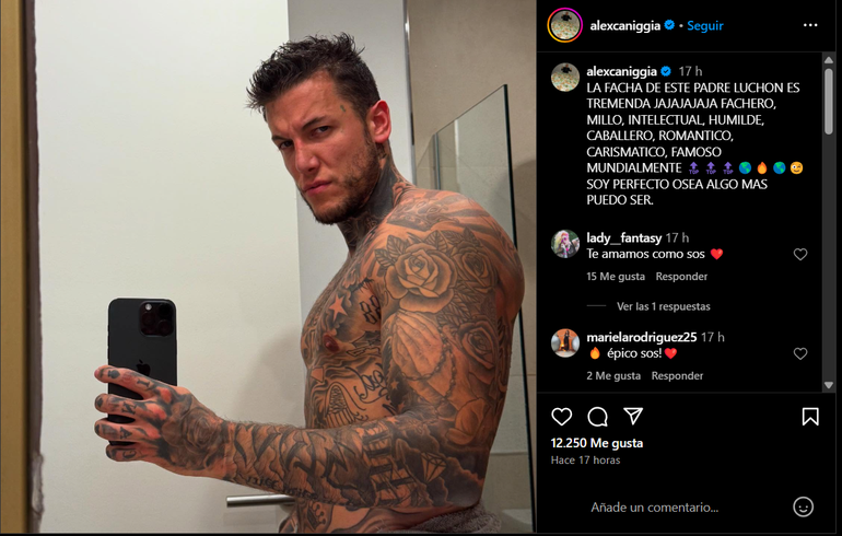 En una nueva etapa de su vida, luego de su tarde junto a su niña, Alex publicó una selfie solo cubierto por una toalla y luciendo su cuerpo tatuado. La postal hot fue acompañada por unos de sus clásicos mensajes en donde bromeó con su flamante soltería y su paternidad. “La facha de este padre luchón es tremenda. Ja, ja, ja. Fachero, ‘millo’, intelectual, caballero, romántico, carismático y famoso mundialmente. Soy perfecto. ¿Algo más puedo ser?”, expresó, junto a la foto que se tomó frente a un espejo.