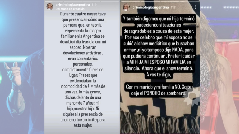 La exvedette y expareja de Ricardo Fort acusó en redes sociales a la coach de acercarse demasiado a su marido durante las grabaciones del programa. “Durante cuatro meses tuve que presenciar cómo una persona que, en teoría, representa la imagen familiar en la Argentina, se desubicó día tras día con mi esposo”, escribió Carbone en sus redes sociales profesionales.